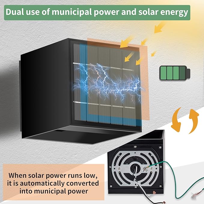 • 【Dual Power Source】Our Solar Wall Light offers the convenience of dual power options. It can be powered by solar energy during the day, harnessing the sun's rays to charge the built-in batteries. Alternatively, it can also be connected to a conventional electrical circuit for power supply. This ensures uninterrupted illumination, even when solar power is insufficient due to weather conditions or limited sunlight.