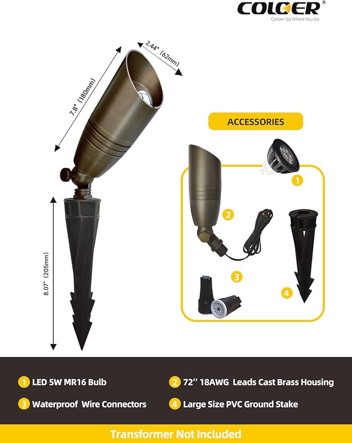 • Lifetime Warranty: The COLOER landscape spotlight uses a design with separate light fixture and bulb, which offers a longer lifespan compared to the non-detachable integrated design.You can replace the bulb without having to replace the entire fixture just because the bulb is broken.We offer a lifetime warranty on the brass light fixture and 5 years for the led bulb. We stand behind our product with our top-rated customer service. Please don't hesitate to contact us if you have any issues.