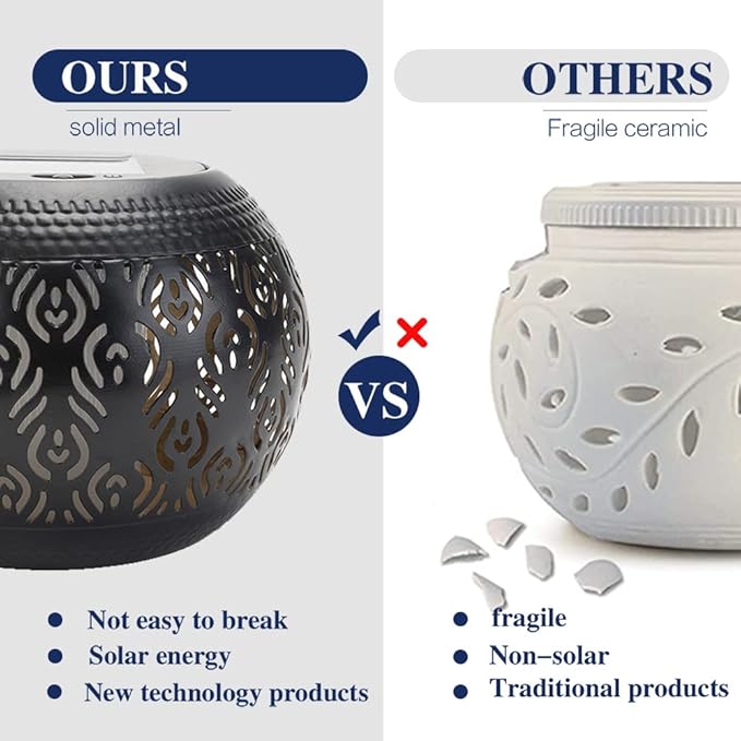 • SPECIAL DESIGN: The solar table light has a unique classical appearance. Special dancing flame Design, which looks like the real flame.The warm yellow light creates a welcoming ambiance. This flickering flame effect will be the best choice for an alternative candle.