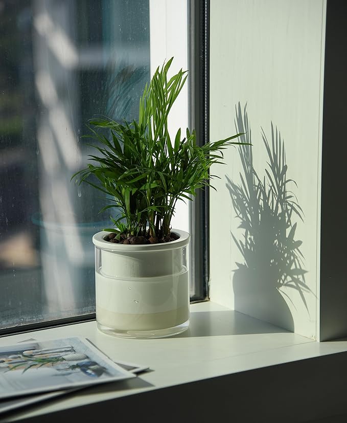• Self-watering System: The bottom section of the white terracotta pot is unglazed, just fill the glass container with water to ensure plants will absorb only what they need through the terracotta pot walls.