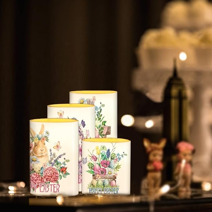 Happy Easter Flameless LED Candles Electric Candles with Remote Timer Colorful Light Control Long Lasting for Easter Day Decorations Pack of 4, Bunny Flower Butterfly Wreath, White