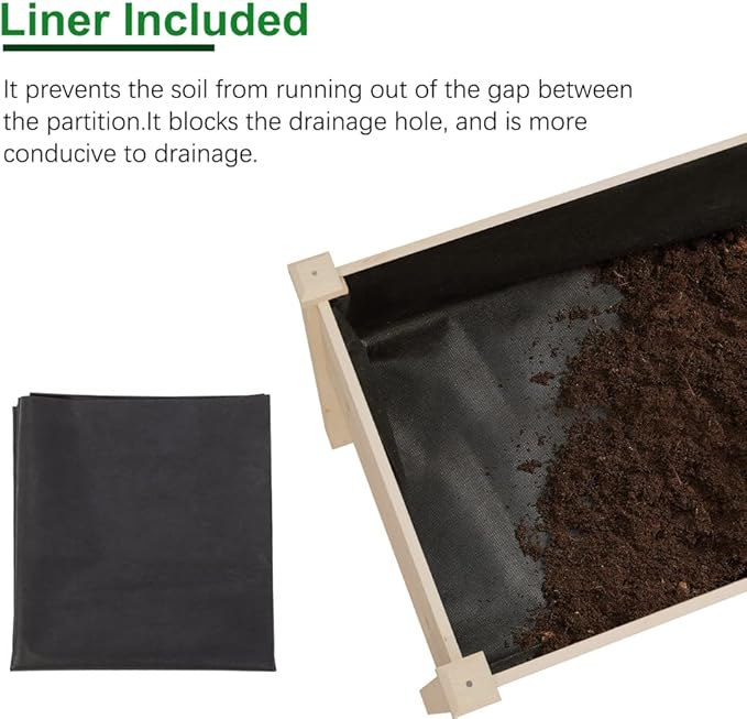 • Raised Garden Bed: Elevated wood planter box with legs for vegetable, flower, and herb growth.