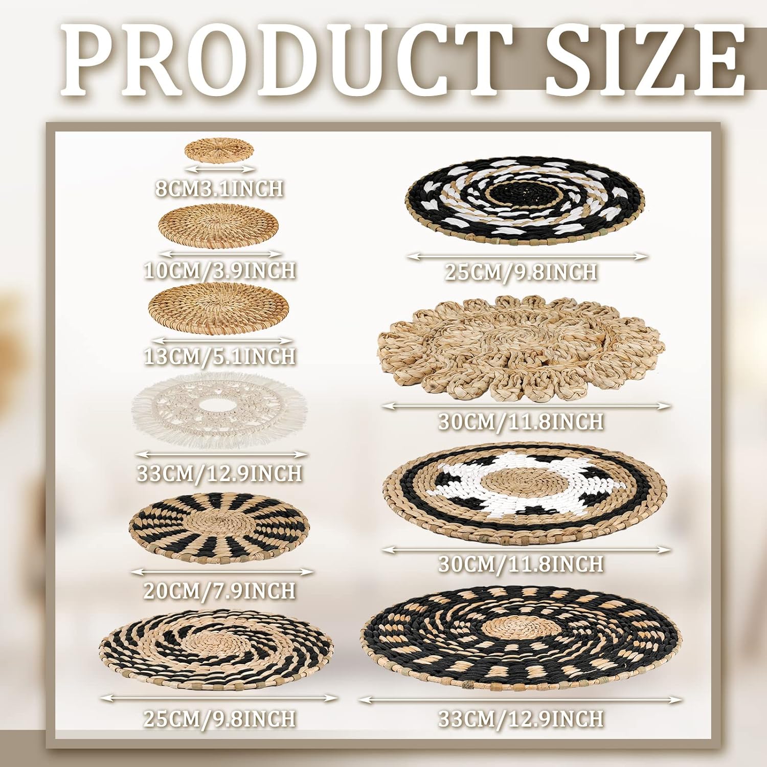• Wide Range of Applications: boho basket wall decor set as placemats, or as decorative baskets to store toys and accessories, the rustic basket wall art is suitable for many occasions, such as hotels, restaurants, living rooms, bedrooms, schools, stores, offices, dorms, shops, spring, summer and more, bringing you an elegant and classic feeling