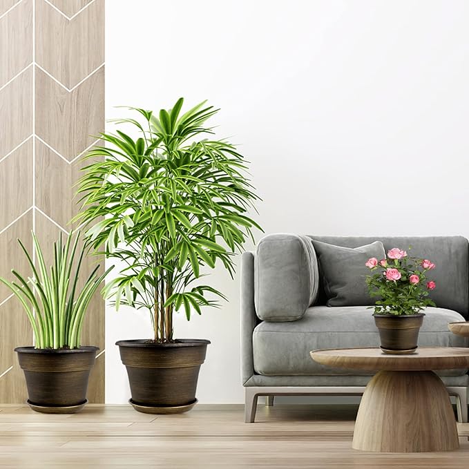 • 【TRADITIONAL DESIGN】Plastic planters for indoor plants with trays are designed in in dark gold colors & a classic look, which allow this pot to fit into any indoor & outdoor setting. With these golded flower pots, it could adds fresh, decorative flair to your home. Decorate your windowsill, desktop, shelf, bedroom, living room, kitchen, garden, office with our 11 inch plastic plant pot.