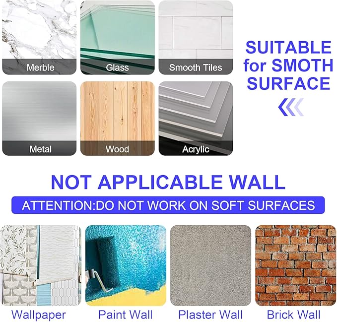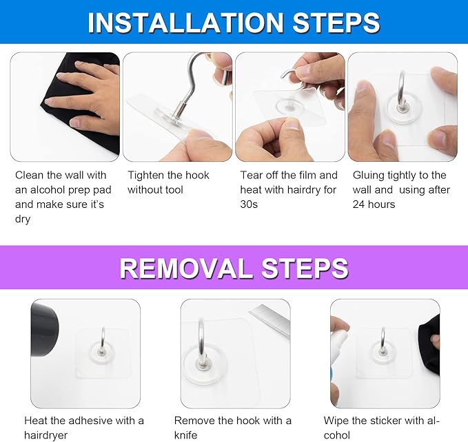 • [EASY INSTALLATION] sticky hooks for hanging can be affixed to a variety of surfaces, such as glass, metal, wood, tile, and concrete, without the need for tools like screws drills