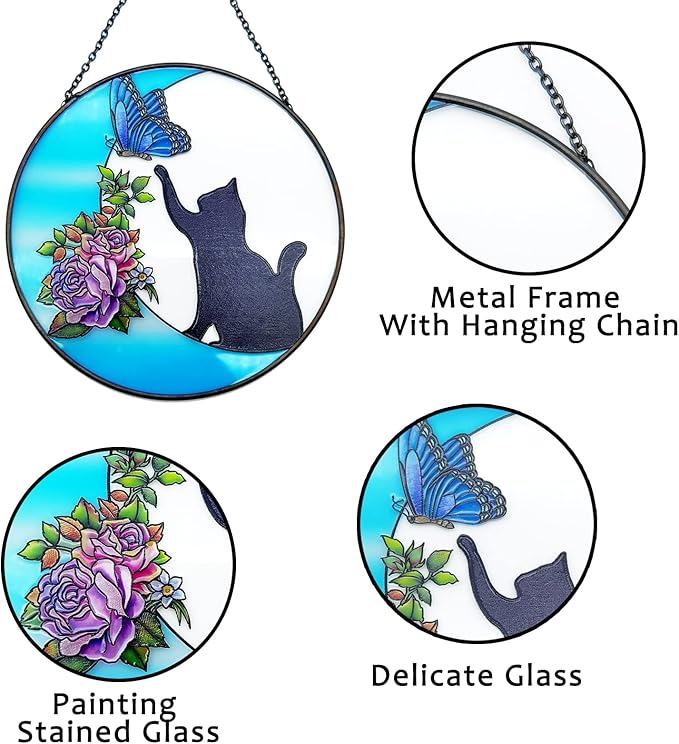 • CAT STAINED GLASS HANDMADE ARTICLE GIFT: The moon cat visor is made of a beautiful piece of colored glass. The special handcrafted drawing of a cute cat catching a butterfly, combined with the moon flower, presents you with a pleasant mood.