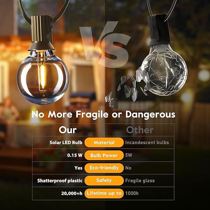 • Application: Replacement LED light bulbs for G40 solar string lights. Perfect outdoor lighting for patio, amazing for residential, commercial, festival and activities like home, backyard, yard, window, fence, garden, deck, pool, canopy, porch, pergola, tent, poles, camping, gazebo, booth, bistro, bar, pub, cafe, restaurant, wedding, hotel, mall, Christmas