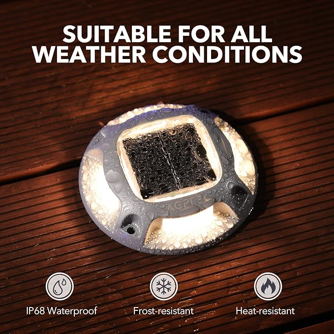 • 【IP68 WATERPROOF & SUPER STURDY】With an IP68 waterproof design and a tightly sealed battery compartment, these solar lights can resist any terrible weather, like a rainstorm, or daily heat. High-quality aluminum alloy shell effectively keeps these outdoor solar LED deck Lights from rusting and can withstand up to 3 tons of weight, no need to worry about automobile and kids stepping on.