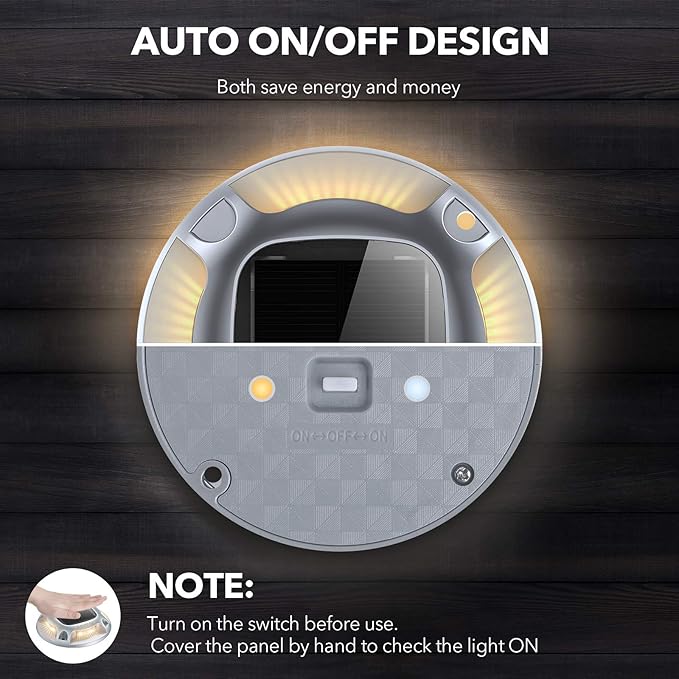• 【FAST CHARGE & LONG LASTING LIGHTING】Adopt the advanced monocrystalline silicon solar panel and high capacity battery (600mAh). Our driveway lights support lighting up from dusk to dawn after 4-5 hours fully charge under full sunlight. No need for hand controlling, these lights will turn on automatically at dusk, and off at dawn.