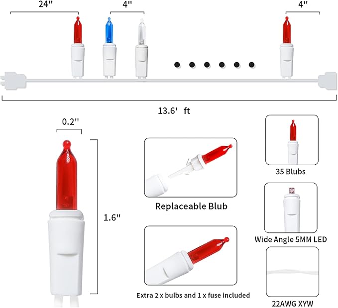 • 【Patriotic Mini String Lights Specification】: 1 Sets - white wire independence day string lights includes 35 count red white blue led lights, total length 13.6ft, lights length 11ft and each led is 4 inches apart, 24 inches lead wire, 4 inches end connector (Extra 2 x bulbs and 1 x fuse included)