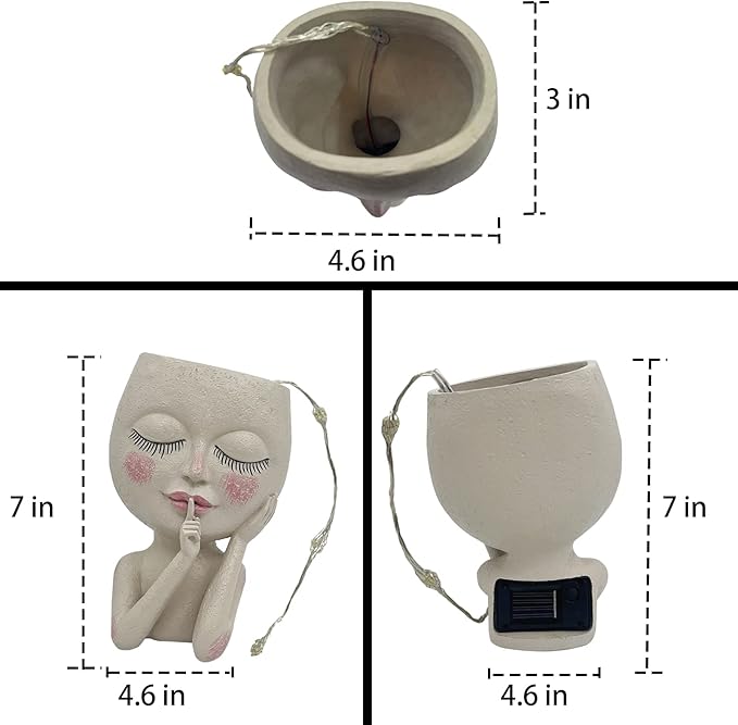 • 🌷【Unique Design Head Planter】If you want to add some creativity and flair to your home decoration, then our flower pots with female head design are perfect for you. Grow all kinds of plants for her hair, you can dress her up and put a necklace around her neck as a finishing touch or add color to her with a jeweled headband. At night, the LED string lights will light up and everyone will be instantly mesmerized by this uniquely designed pot head planter