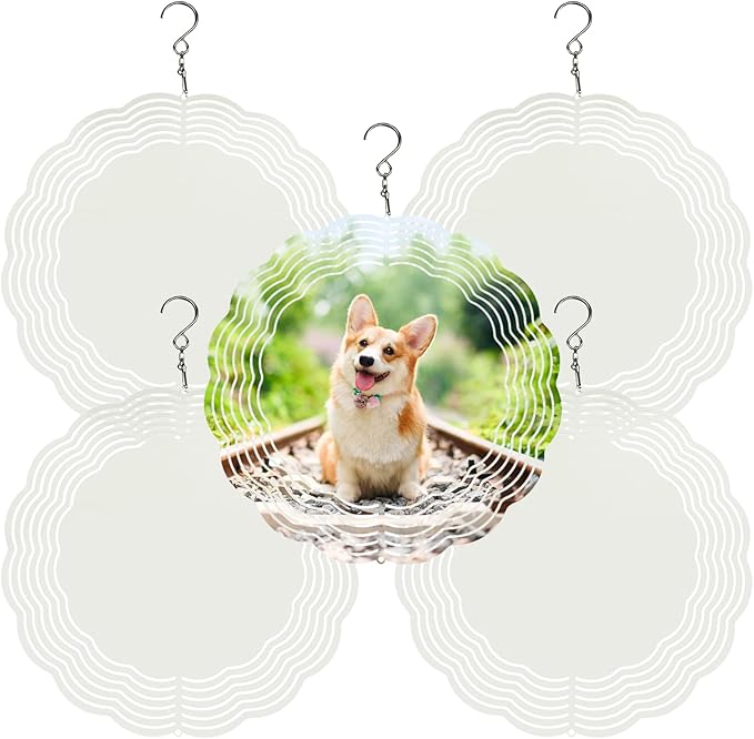 • 【Package Contents】You will get 5 pack of Sublimation Wind Spinner blanks and 5 hooks. The size of each Wind Spinner Blank is about 8 inches. These Wind Spinners can be used for double-sided sublimation and DIY your favorite patterns.