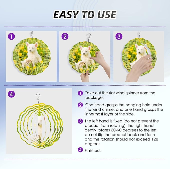 • 【Widely Used】These 3D Metal Sublimation wind spinners can be used for yard, garden, indoor, outdoor, windows, porch decoration; they can also be given as a present to your friends and family. This versatility makes them a popular choice for individuals looking for unique present.