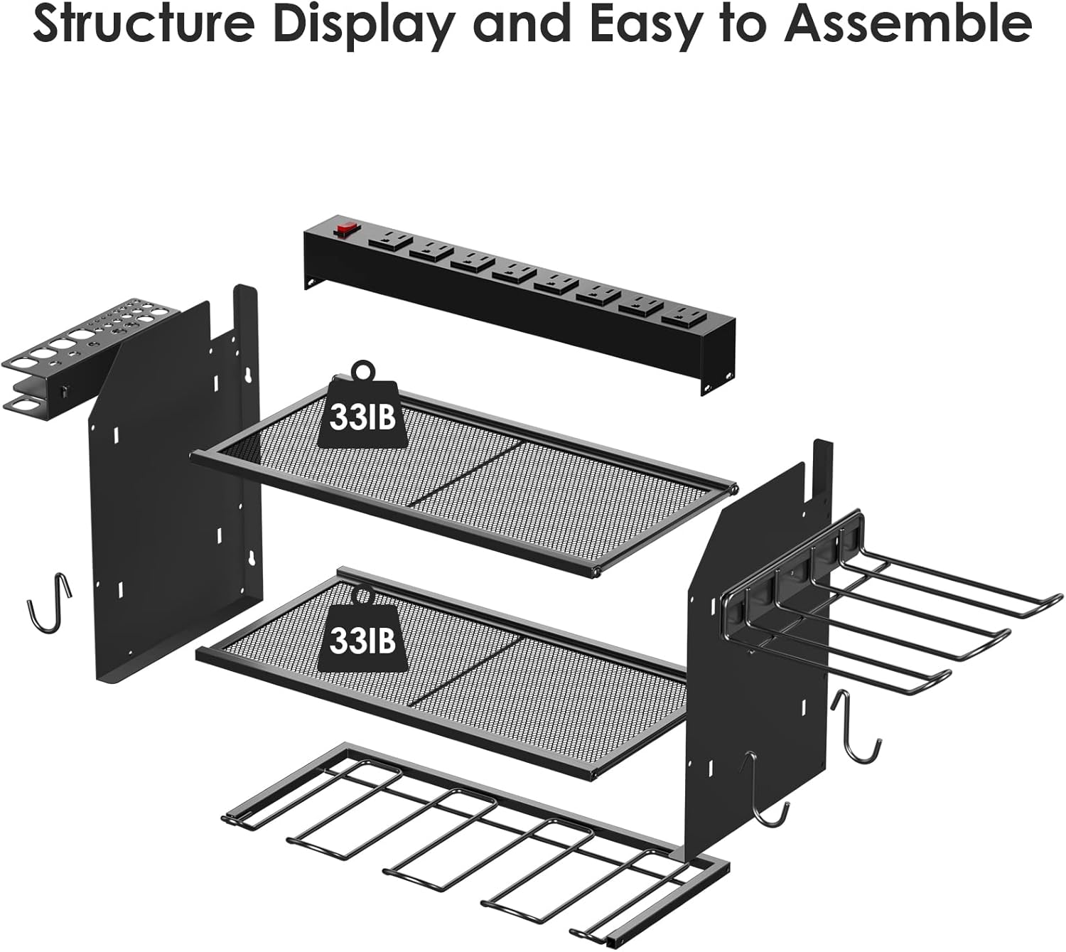 • Easy to assemble and mount on a peg board, If you need more storage space, you can connect the two shelves (or more) by screws. Each layer of the grid can support a maximum weight of 33IB. Made from heavy gauge steel.