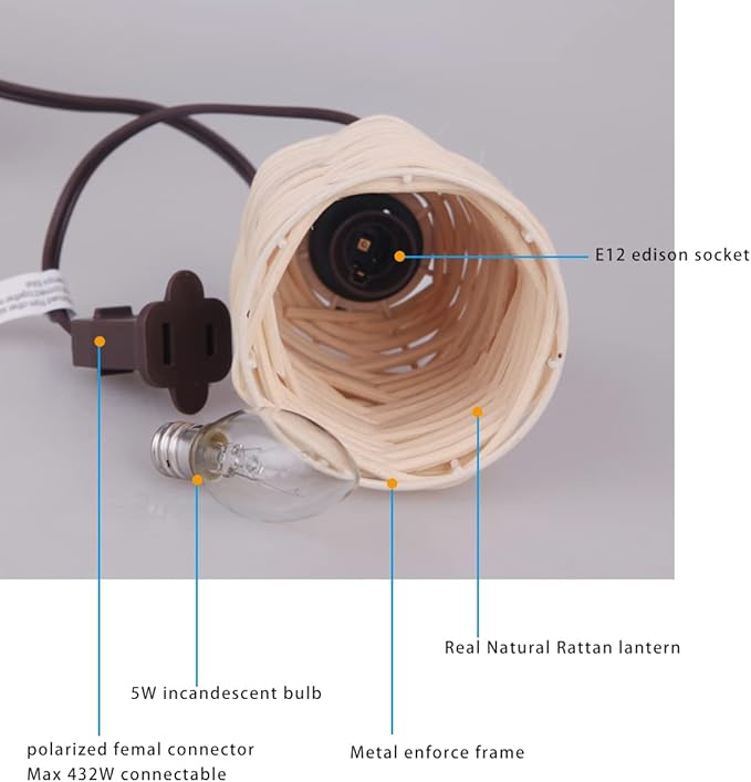 • Connectable wicker Lantern String Lights: The total length 10ft with polarized plug and connector.End-to-end up to Maximum 432 watts total.