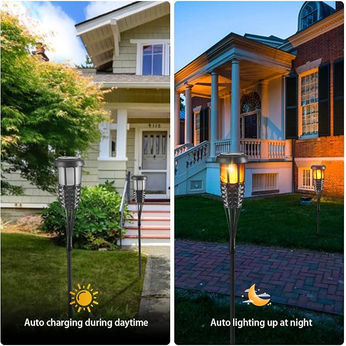 • Adjustable Length: The solar torch light with flickering flame is available in two lengths, you can adjustable the length according to your needs. Up to 48 inches when inserted into the ground