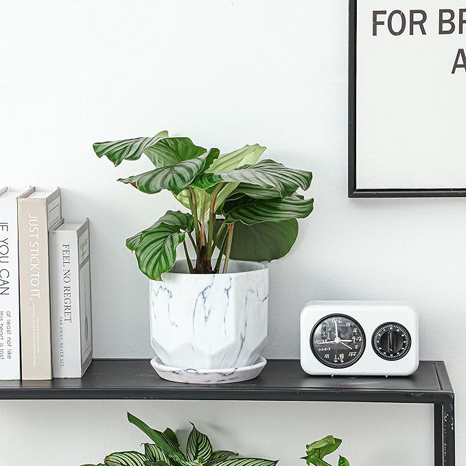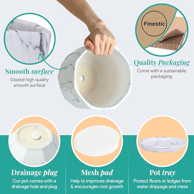 • [WHAT MAKES IT PREMIUM PRODUCT] Finestic planters are not ordinary plant pots. Pots are designed locally in the US and made with the best manufacturing standards. Hand Glazing with Marble Pattern takes twice the cost and effort than regular ceramic pots. Pot comes with saucer matching tray, drainage hole, drainage plug, and mesh pad. Higher thickness and sustainable packaging are another addition to the premium offering.