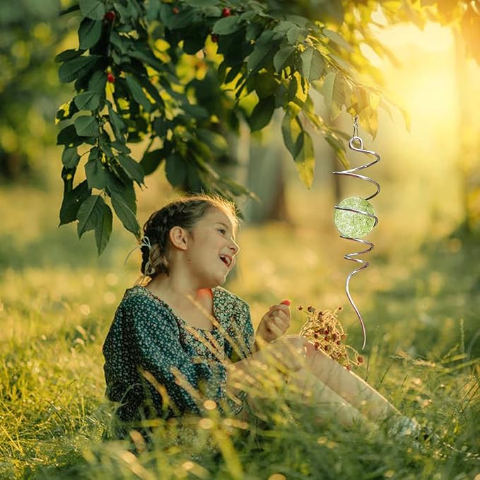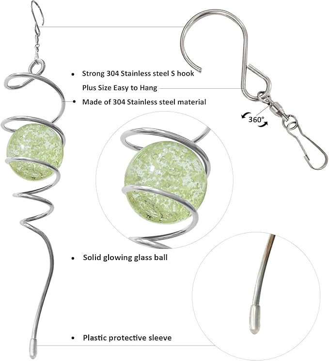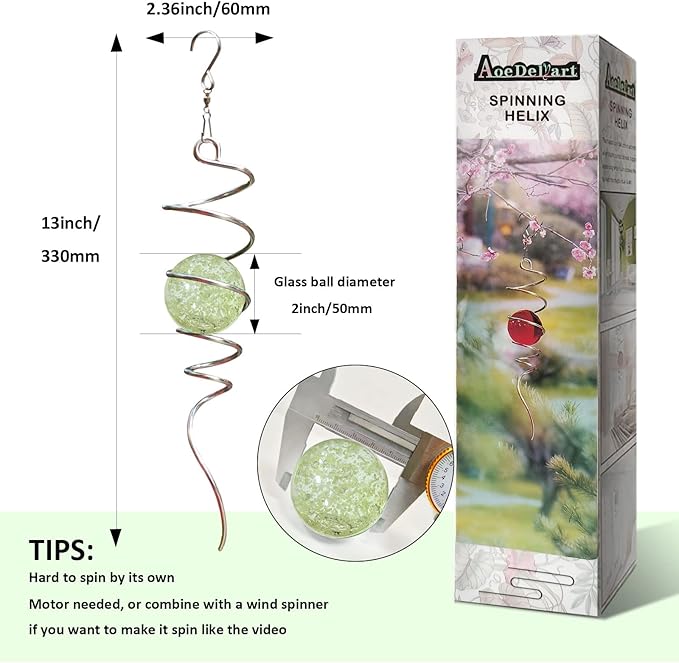 • 【Easy To Position】The Wind Spinner Stabilizer Spiral can't spin by itself ,if you want to make it spin like the video ,need add 1pc motor (not include) ,or combine it with a wind spinner or any rotatable hanging ornament to help it rotate. Come with 1pc 2 inch colored glass orb(not paint), 1pc silver color spiral tail twister,and 1pc swivel hook accessory, ready to hang and enjoy.