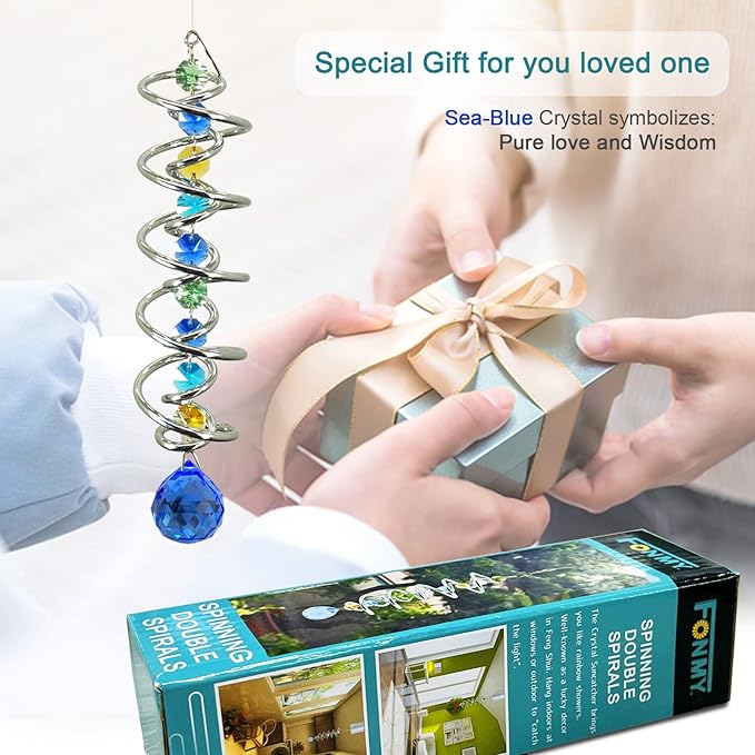 • 【HIGH QUALITY】:Made of stainless steel wire and crystal material, specail double structure spiral tail w/ solid blue color K9 crystal glass ball and raibow color chain crystals , promised good weather resistant and amazing decoration. All FONMY crystal ball made of top crystal glass material with finely crafted, high clarity and cast beautiful rainbows, could turn the sun's rays into many rainbows.