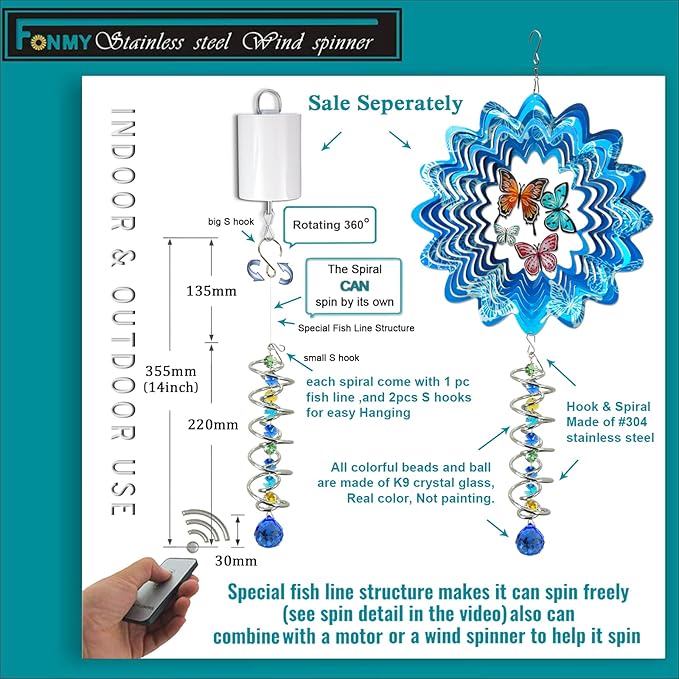 • 【PREMIUM CRYSTAL SUNCATCHER】The spiral with crystal is a special sun catcher rainbow maker, it’s Super Sparkly under sunshine. You can also add a motor(not include) to let the spiral to spin ,while spiral tail rotating (it can’t spin by itself.), the crystal ball seems to move up and down like floating and dancing in air, presents the magical visual illusion.