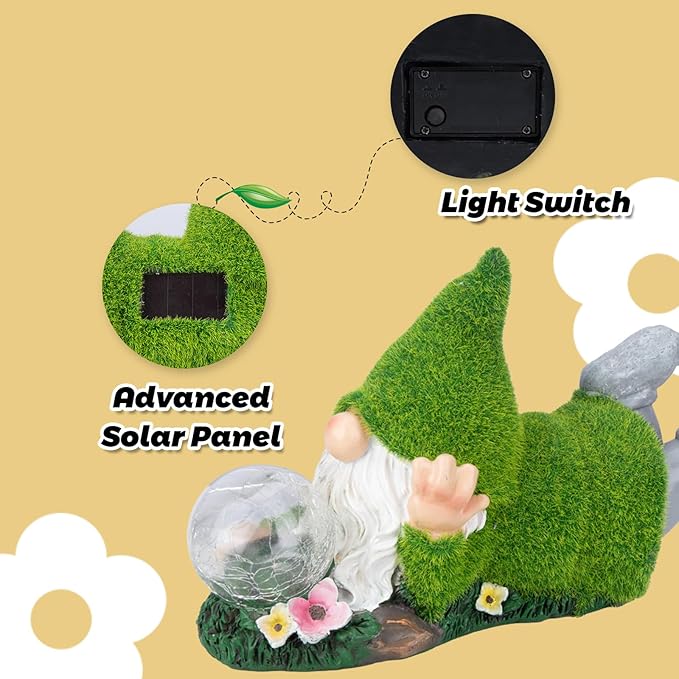 • 【Funny Garden Gnomes】 Flocked gnome lie on lawn and with crackle glass globe. This cute garden sculptures & statue is suitable for outdoor yard outside garden decorations