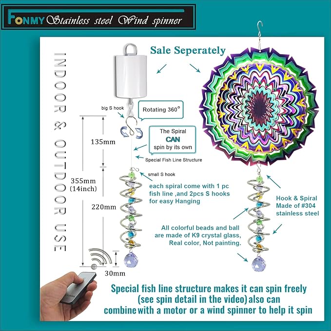 • 【PREMIUM CRYSTAL SUNCATCHER】The spiral with crystal is a special sun catcher rainbow maker, it’s Super Sparkly under sunshine. You can also add a motor(not include) to let the spiral to spin ,while spiral tail rotating (it can’t spin by itself.), the crystal ball seems to move up and down like floating and dancing in air, presents the magical visual illusion.