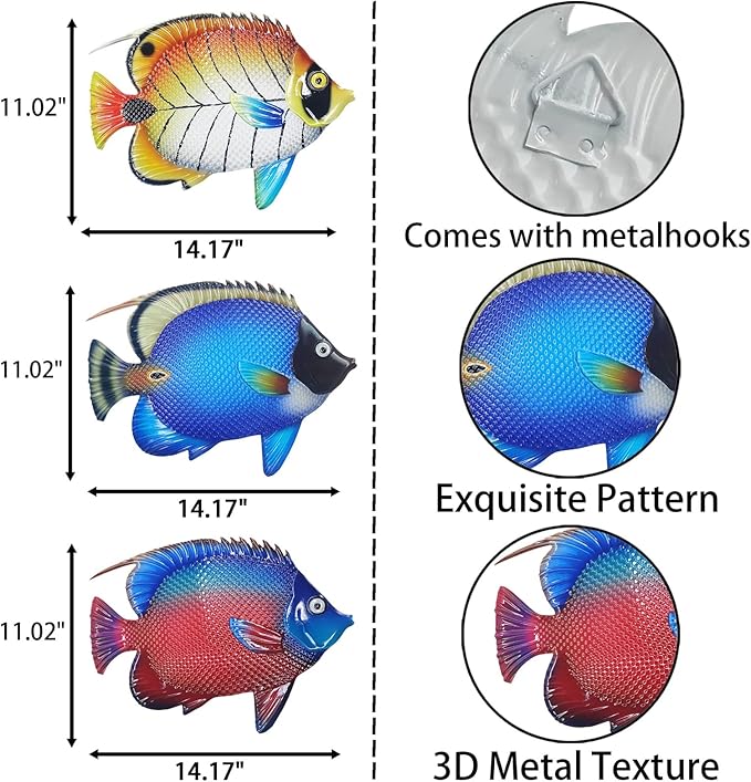 • Product Details - You will get 3 piece fish decoration - Measures 14 x 10 inches. The vivid metal wall decor matches is perfect for any decor style and can be displayed in bedroom, living room, office, study, baby room, kitchen, yard, porch, patio, garden and more