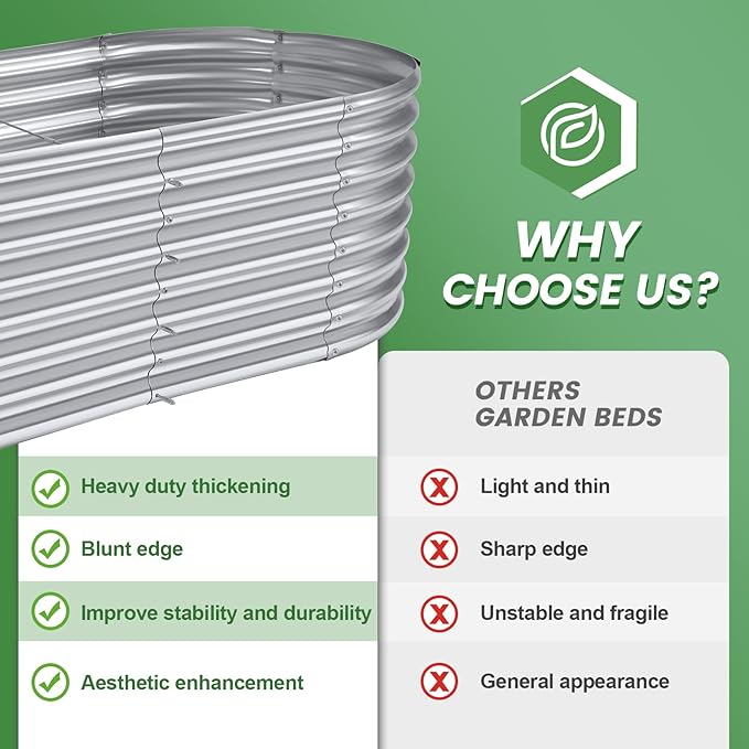• Upgraded quality and structure: raised garden beds outdoor are made of Q195 galvanized metal sheet, double-layer anti-corrosion galvanizing and oval structure design, which is more beautiful, can withstand greater pressure at the interface, is not easy to loose, and the interface will not Deformed and can be reused for many years.