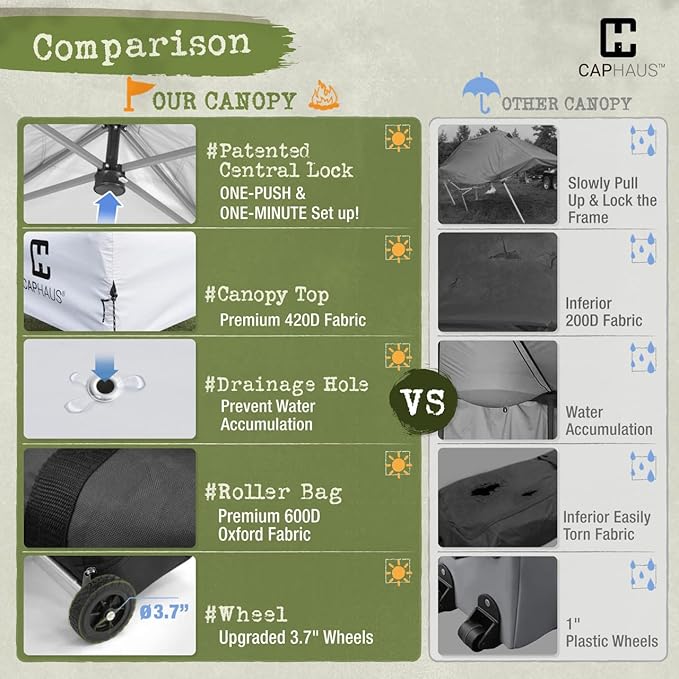 • Patented One-Push Set Up - Experience the easiest set up with the CAPHAUS ez up canopy! Our patented one-push center lock technology allows you to lock out all four legs with a single push, while the soft pinch-free buttons let you adjust the leg height from 3ft 4” to 6ft 4” without any hassle. Don't settle for complicated canopies – choose CAPHAUS and set up your shelter effortlessly!