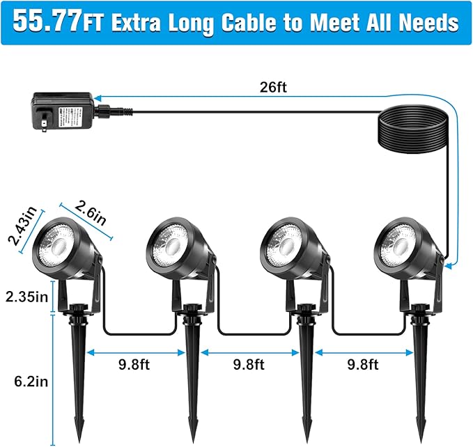 • 【55.77FT Extra Long Cable】We have ultra long cables to meet your needs. Let you have a long enough distance between each Christmas light. The distance from the plug to the first Christmas spotlight is 26FT. The distance between the Christmas landscape lights is 9.8FT, which meets your daily lighting needs.