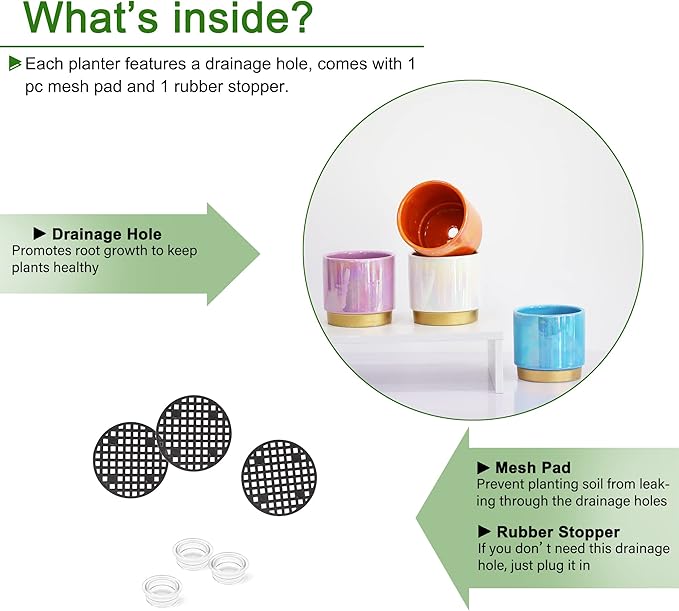 • Size & Package: Set of 4 - 4.0 Inch Pots for Plants Indoor. Package: contains 4 ceramic pots for indoor plants, 4pcs mesh pads, and 4pcs rubber stoppers (NOT INCLUDE PLANTS)