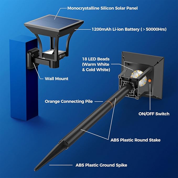 • 【IP65 Waterproof & Long-lasting】Made of ABS plastic and reaching the sealing process with an IP65 waterproof rating, our solar powered outdoor lights are designed to withstand most weather conditions, such as sunny, rainy, frosty, sleet or light snowy days for multi-season outside use.