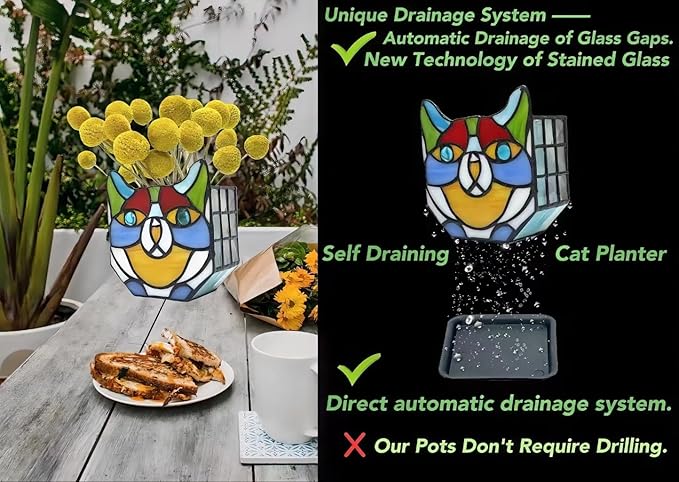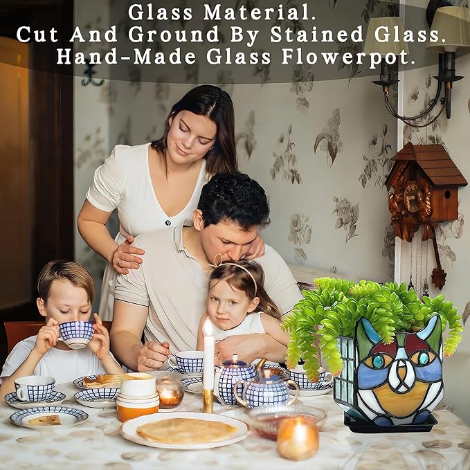 • CAT PLANT CONTAINER:The stained glass cat planter is the perfect addition to any houseplant collection; Features a unique cat design that will add a playful touch to any room