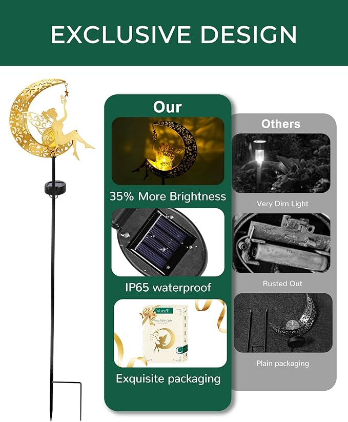 • WEATHER-RESISTANT: Our Vuees solar garden decor lights are constructed with premium stainless steel and thick brass, ensuring durability. They are coated with rustproof paint and feature a waterproof IP65 design, allowing them to withstand various weather conditions and maintain long-lasting functionality.