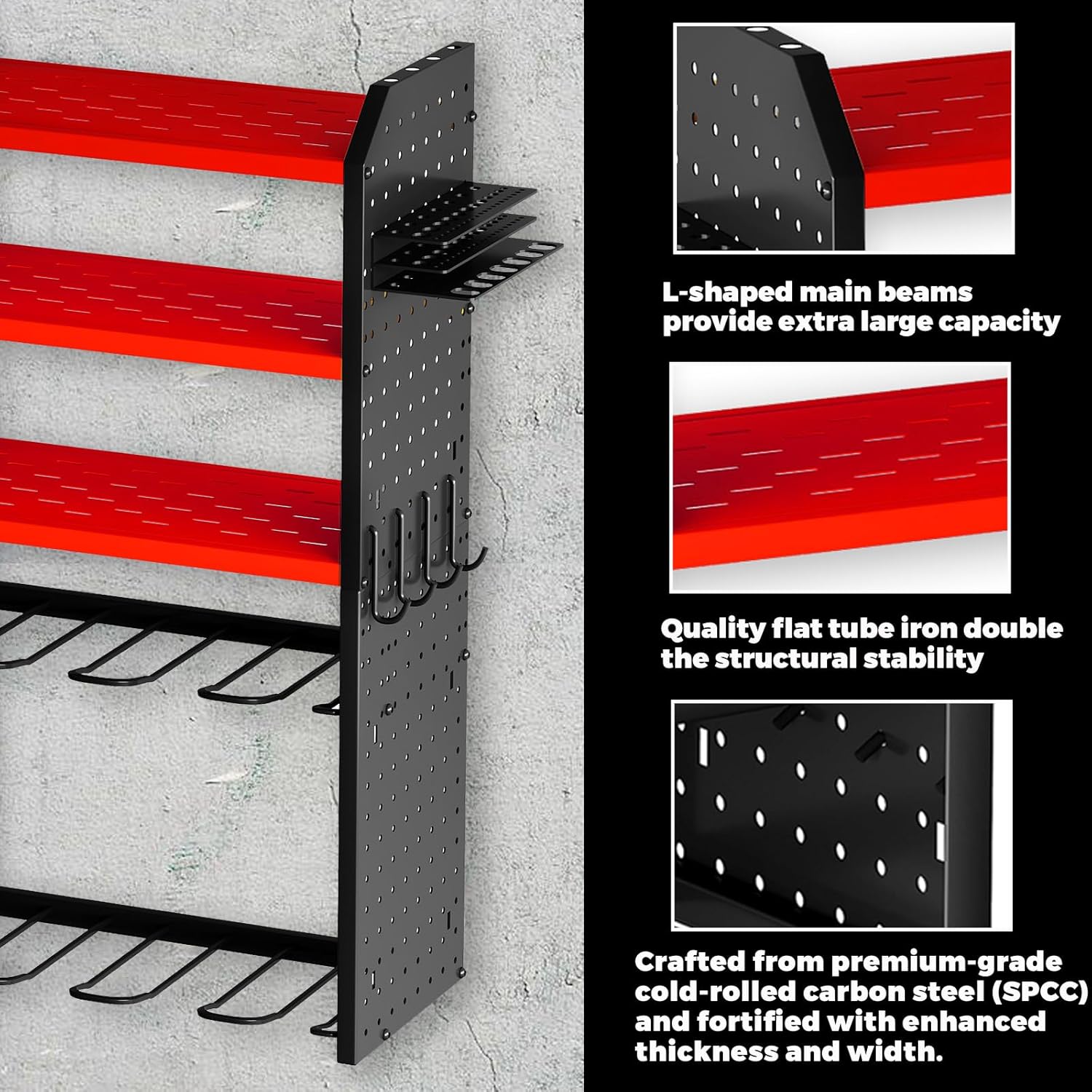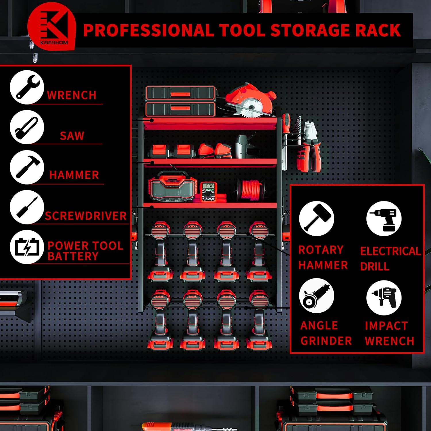 KAFAHOM Power Tool Organizer, Large 8 Drill Holder Wall Mount with 2 Side Pegboards,5 Layer Heavy Duty Metal Tool Storage Rack, Tool Shelf for Garage Organization, Utility Battery Shelves - Red