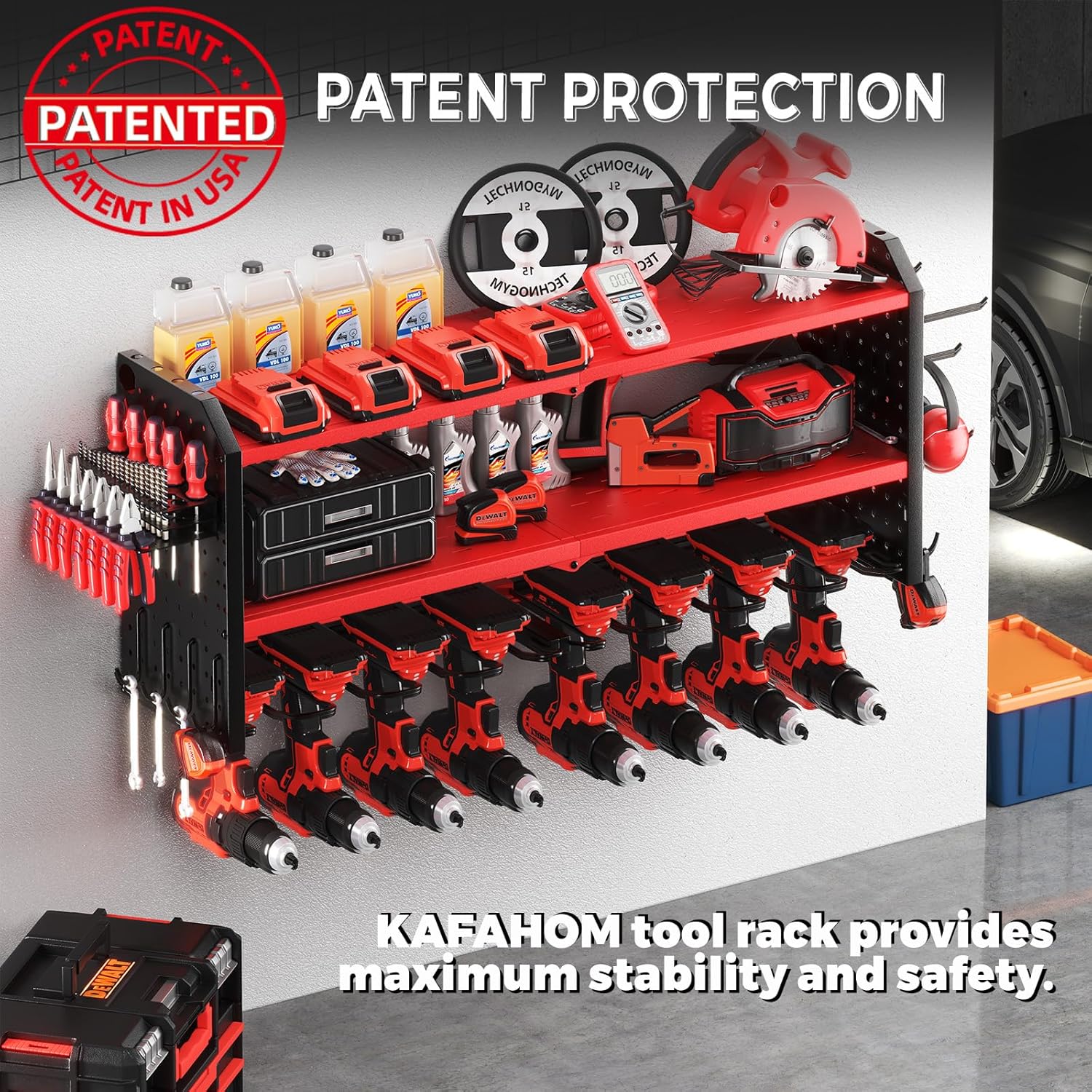 • STRUCTURAL OPTIMIZATION: The KAFAHOM top-of-the-line garage organization rack features a revolutionary structure design that provides exceptional stability and increased weight capacity for your power tools. Thanks to the optimized structural design and aspect ratio - not only is it can perfect for the 16" wall studs, but the utility cordless drill holder can be mounted on concrete, drywall, pegboard. Plus, the lower part can hold up to 8 heavy power tools.