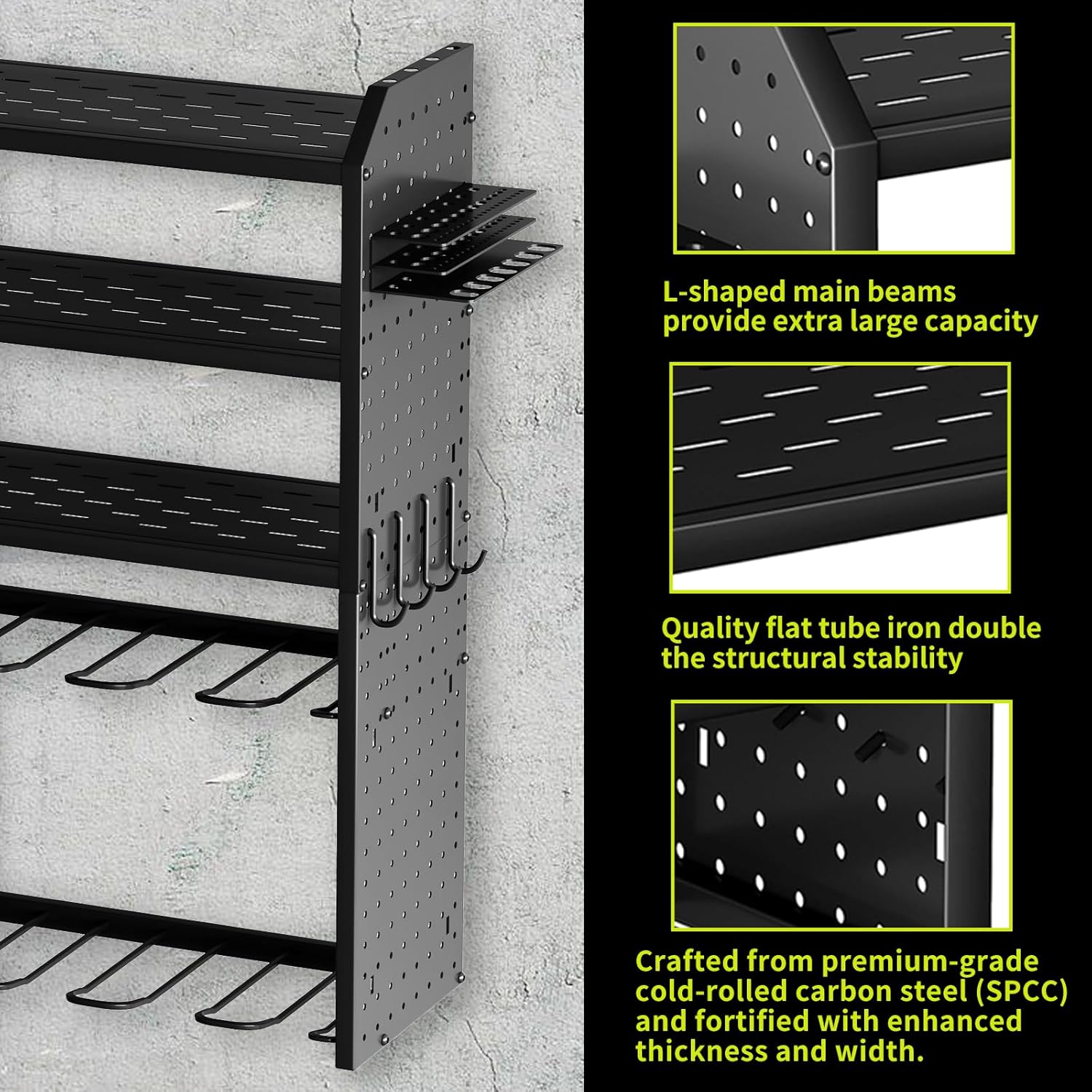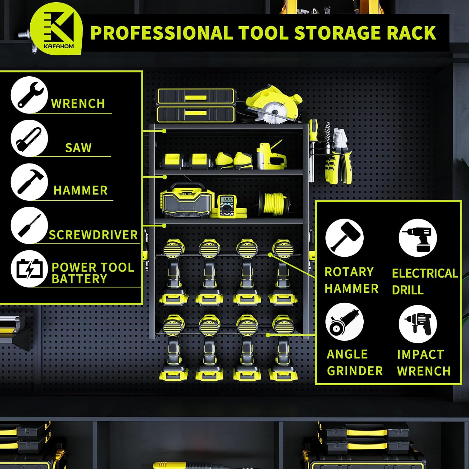 • COMPACT SOLUTION: KAFAHOM tool organization and storage has a high capacity for all your tools! With two downside racks, it can hold up to 8 drills and heavy-duty shanked power tools, while the 3 extra upper layers provide ample space for accessories such as hardware boxes, wrenches, screwdrivers, and pliers. With clever space design, our tool rack wall mount shelf helps free up space and keep your garage organization area clean and tidy.