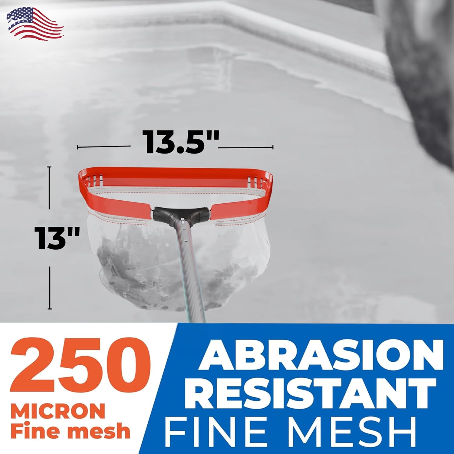 • WORK FASTER WITH "SMOOTH GLIDE" 250 MICRON MESH - The perfect "just right" combination of speed and filtration. Grab virtually all surface and sunken pool debris (including san, silt and pollen) from your client's pool without "pushing" all the water. Skim and rake quickly and efficiently, banking that time for more pools or more family time after a long day.