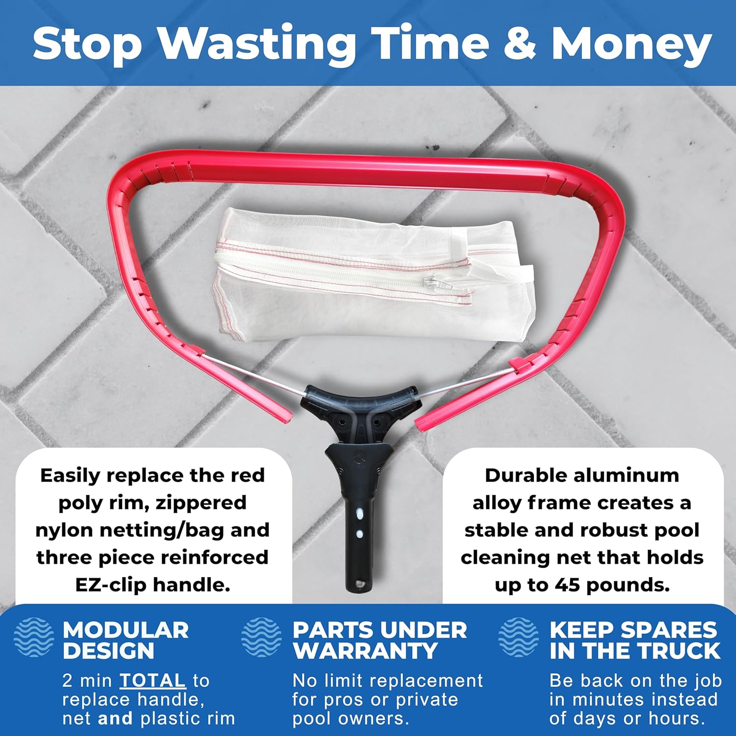 • NEARLY ELIMINATE DOWNTIME DUE TO BROKEN TOOLS - Keep an unlimited number of pool skimmer net part replacements (handles, nets, rims) in your truck (all at half off retail) for quick and easy on-site tool repairs. Stay on the job, making money and working hard for your clients.