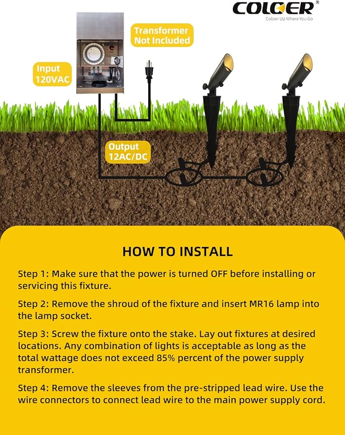 • Lifetime Warranty: The COLOER mini landscape spotlight uses a design with separate light fixture and bulb, which offers a longer lifespan compared to the non-detachable integrated design.You can replace the bulb without having to replace the entire fixture just because the bulb is broken.We offer a lifetime warranty on the brass light fixture and 5 years for the led bulb. We stand behind our product with our top-rated customer service. Please don't hesitate to contact us if you have any issues.