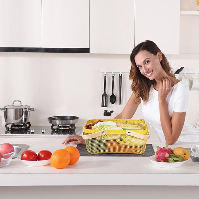 Portable Mesh Harvest Basket - Natural Bamboo Handle Foldable Organizer for Kitchen, Garden & Picnic | Ventilated Storage Bin with Rust-Proof Wire, Space-Saving Farmhouse Decor (Lemon Yellow)