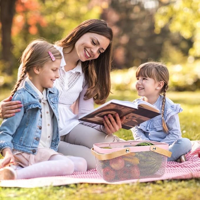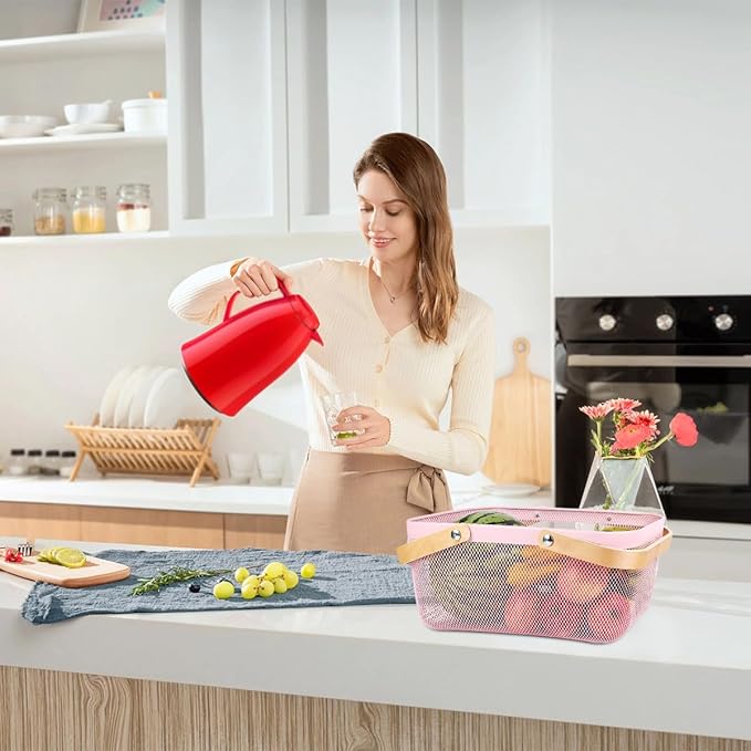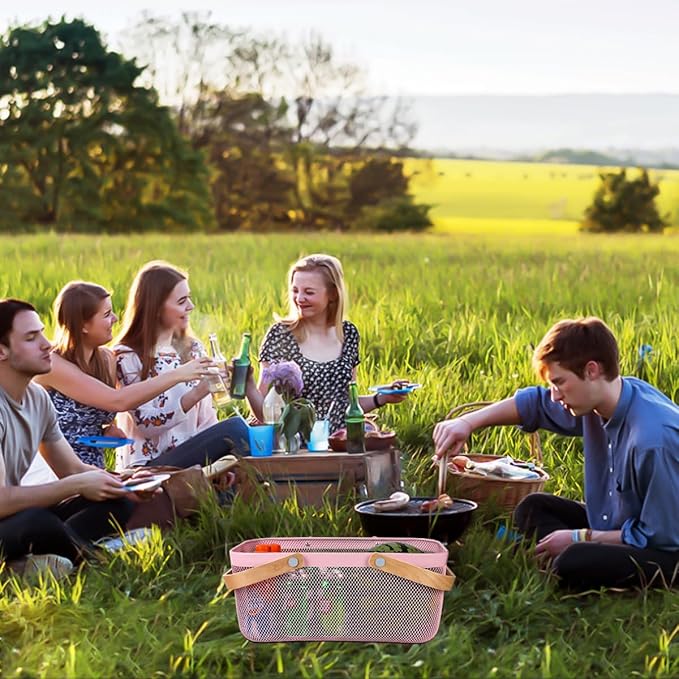 Portable Mesh Harvest Basket - Natural Bamboo Handle Foldable Organizer for Kitchen, Garden & Picnic | Ventilated Storage Bin with Rust-Proof Wire, Space-Saving Farmhouse Decor (Pink)