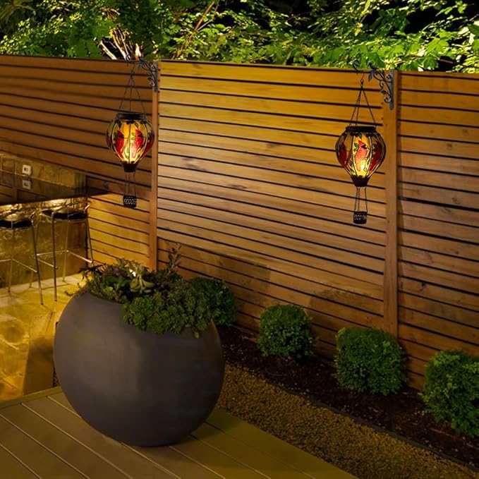 • 【Unique Hot Air Balloon Design】--This hanging solar light is composed of 8 pieces of cardinal glass with lifelike flame lights. As night falls, their glow adds warmth and comfort to your garden, patio, yard, path, and more, great Christmas decorative lights.