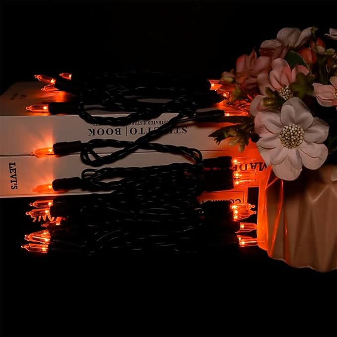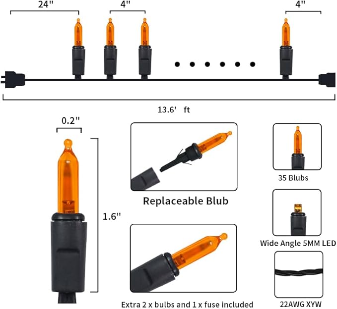 • 【Mini Halloween Lights Specification】: 1 Sets - black wire halloween light strings includes 35 count orange led lights, total length 13.6ft, lights length 11ft and each led is 4 inches apart, 24 inches lead wire, 4 inches end connector (Extra 2 x bulbs and 1 x fuse included)