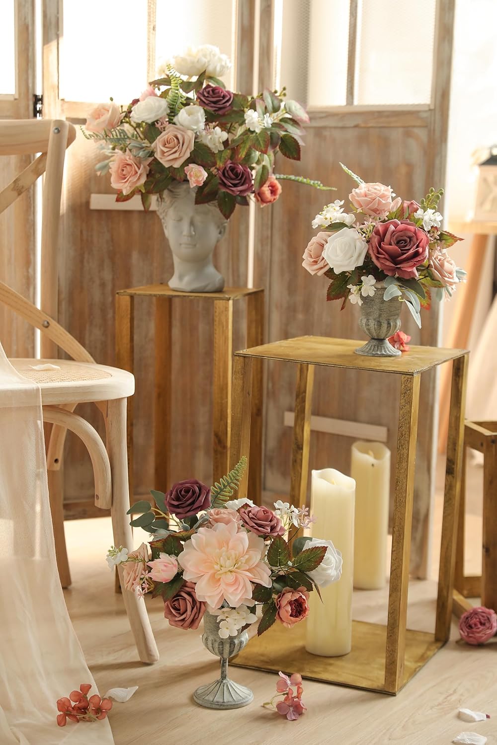 • Packaging Details: silk roses x4, peonies x3, dahlias x1, peonies x1, bluebells x2, PE foam roses dusty roses x4, light roses x3, pink currant x1, white x2, included accessories: small flowers x22, green leaves x12.