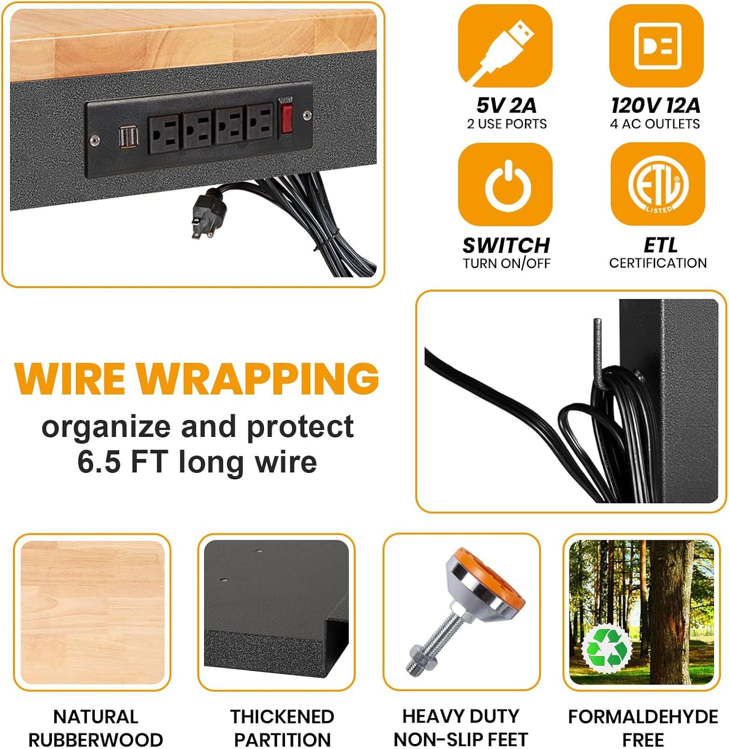 • 【Power Strip】We fitted a power outlet for the work benches for garage.Convenient for you to use a variety of power tools and lamps. sewing table has 4 AC Outlets and 2 USB-A ports on the power strip.