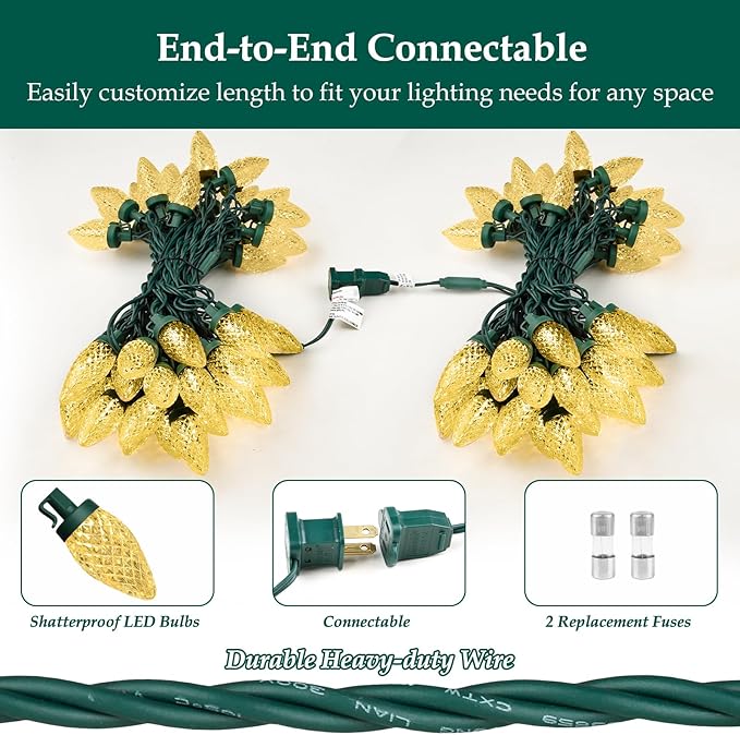 • 🍓【Shatterproof C9 Strawberry LED Bulbs】 Each strand of string lights is 34 feet long and equipped with 50 bright C9 strawberry-shaped LED bulbs. They are easy to use - just plug and unplug for ON and OFF - and long enough to wrap around a Christmas tree or anywhere else you'd like to add some light, such as your porch, garden, lawn, yard, or roof.