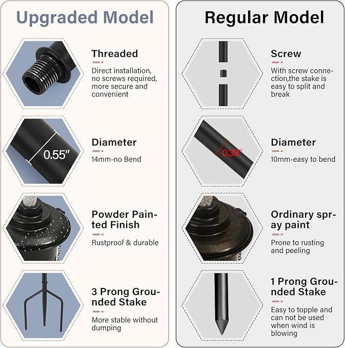 • ✿3 Prong Grounded Stake: Metal Torch has 3-prong grounded stake,means the firmness and stability are much better than 1 prong, ensuring the metal torch lasts for several seasons.