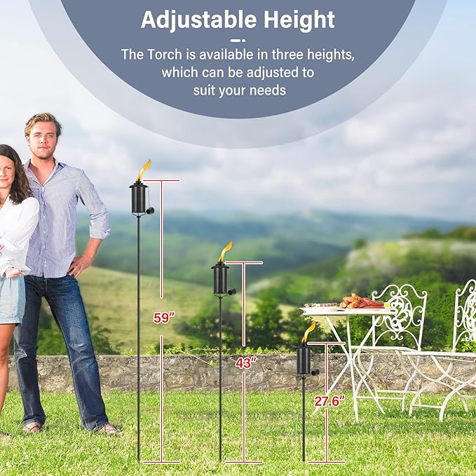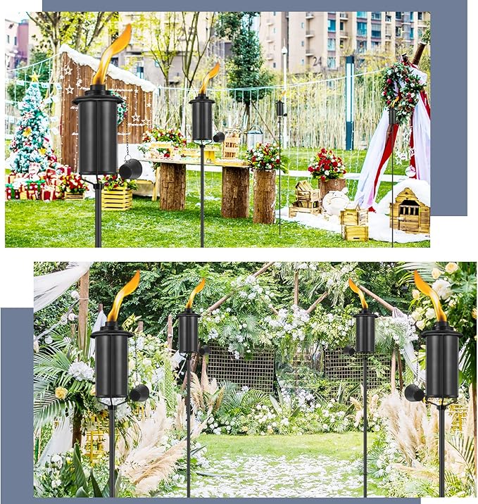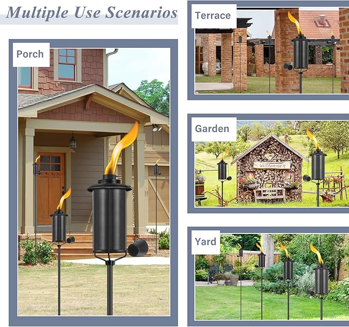 • 🏡Outdoor Décor:This torch features a distinctive black finished metal design,can DIY Height, a long-lasting fiberglass wick & metal snuffer to safely extinguish the flame at any time.Suitable for a variety of theme parties, making the outdoor environment romantic and cozy.