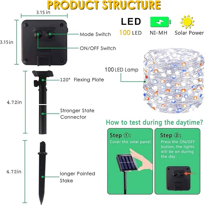 • 8 Lighting Modes & Memory Function : Our America-themed color solar lights outdoor waterproof have the On/Off button and mode button. You can select 8 different modes to satisfy your diverse needs by pressing the mode button. And the built-in memory chip saves your last modes setting, so there is no need to reset it again